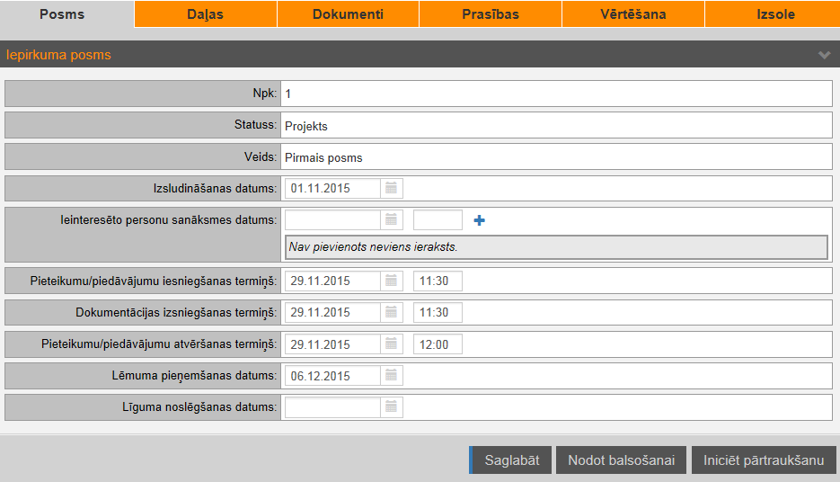 Ja iepirkumam ir vairāki posmi, par katru posmu tiek uzturēta šāda informācija: