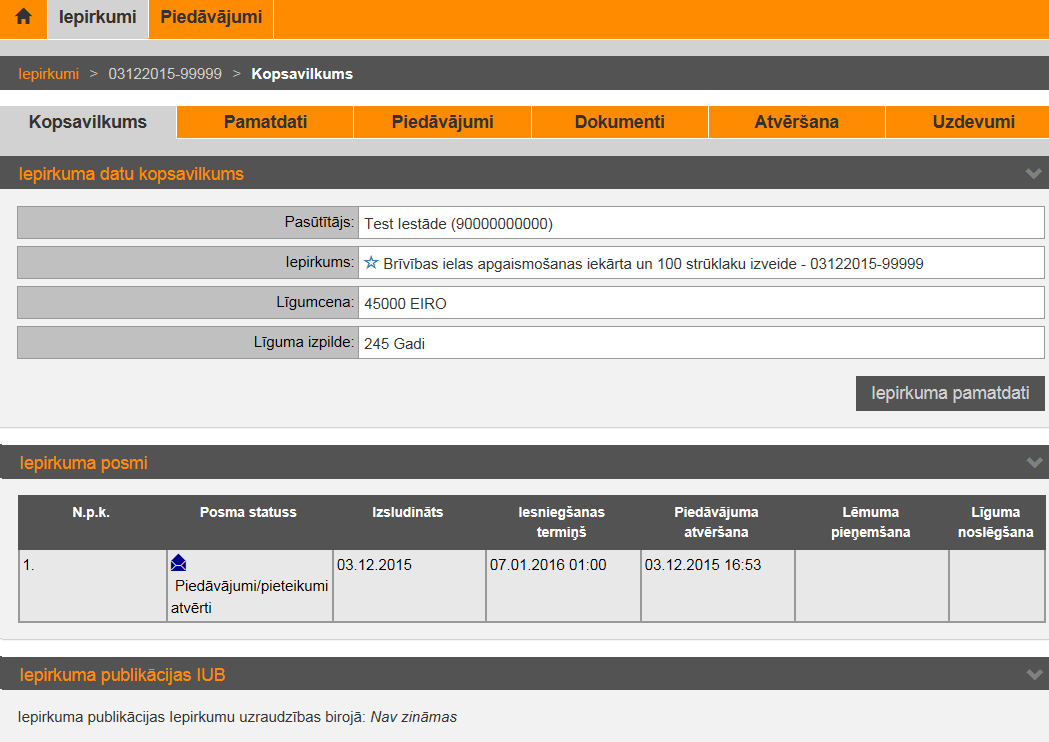 − „Pamatdati” – iepirkuma un tā posmu informācija, pieejama darbība piedāvājuma izveidošanai (sk.14.4 Iepirkuma pamatdati, piedāvājuma izveides uzsākšana).