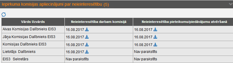 Blokā “Dokumenti – Iepirkuma komisijas apliecinājumi par neieinteresētību” tiek attēlots IK dalībnieku saraksts un neieinteresētības paziņojumu parakstīšanas informācija.