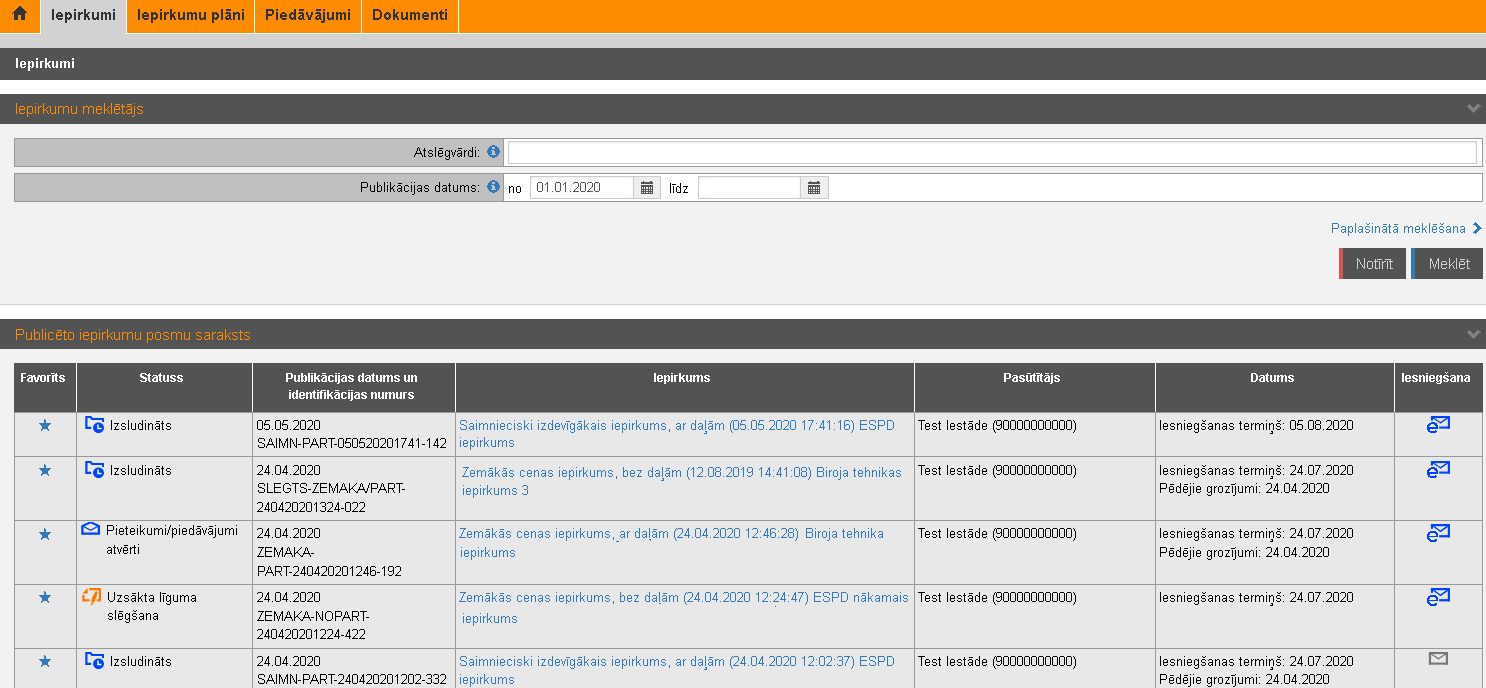 Meklēšanas kritērijiem atbilstošais iepirkumu saraksts. Iepirkumi sakārtoti dilstoši pēc izsludināšanas datuma, t.i., jaunākie publicētie saraksta sākumā. Pie iepirkumiem, kur lietotāja organizācija