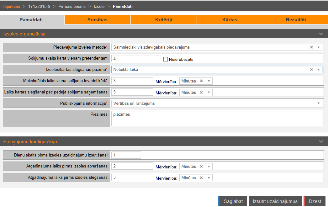 Var modificēt, dzēst līdz uzaicinājumu pretendentiem izsūtīšanai.