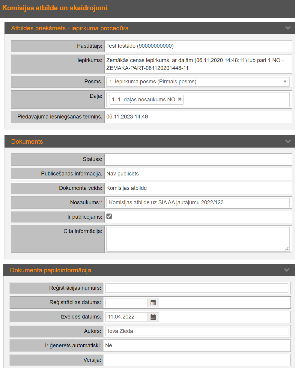 Lai reģistrētu sistēmā komisijas atbildi vai skaidrojumu uz pretendenta jautājumu: