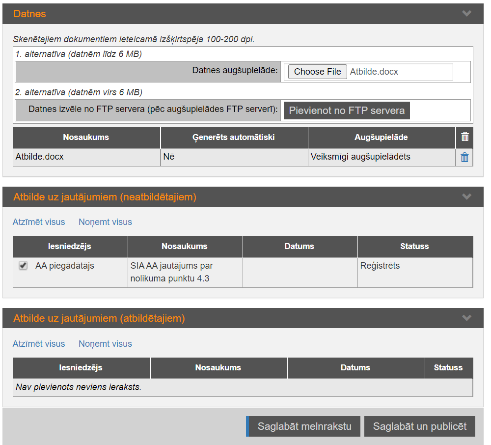 2. Aizpilda atbildes formu, pievieno datni(-es). Ja atbildi nepieciešams publiskot, atzīmē izvēles rūtiņu laukā Ir publicējama.