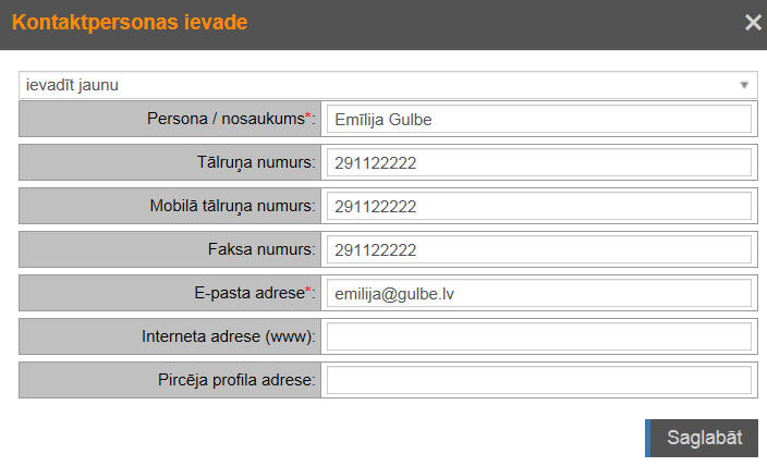 Formas augšdaļā norāda – ‘ievadīt jaunu’ un aizpilda kontaktpersonas informāciju, vai arī izvēlas jau iepriekš saglabātu kontaktpersonas ierakstu.