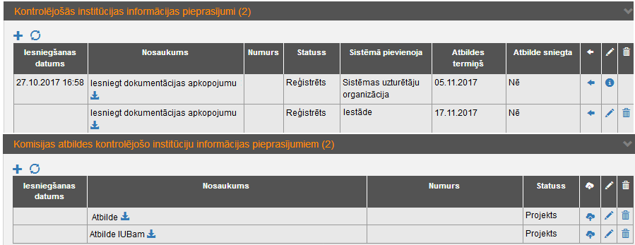 Blokā “Dokumenti – Kontrolējošās institūcijas informācijas pieprasījumi” IUB darbinieks pievieno informācijas pieprasījuma dokumentu, norādot arī atbildes sniegšanas termiņu, vai arī IK locekļi pievieno pieprasījumu, kas no IUB vai citas kontrolējošās institūcijas saņemts ārpus sistēmas.