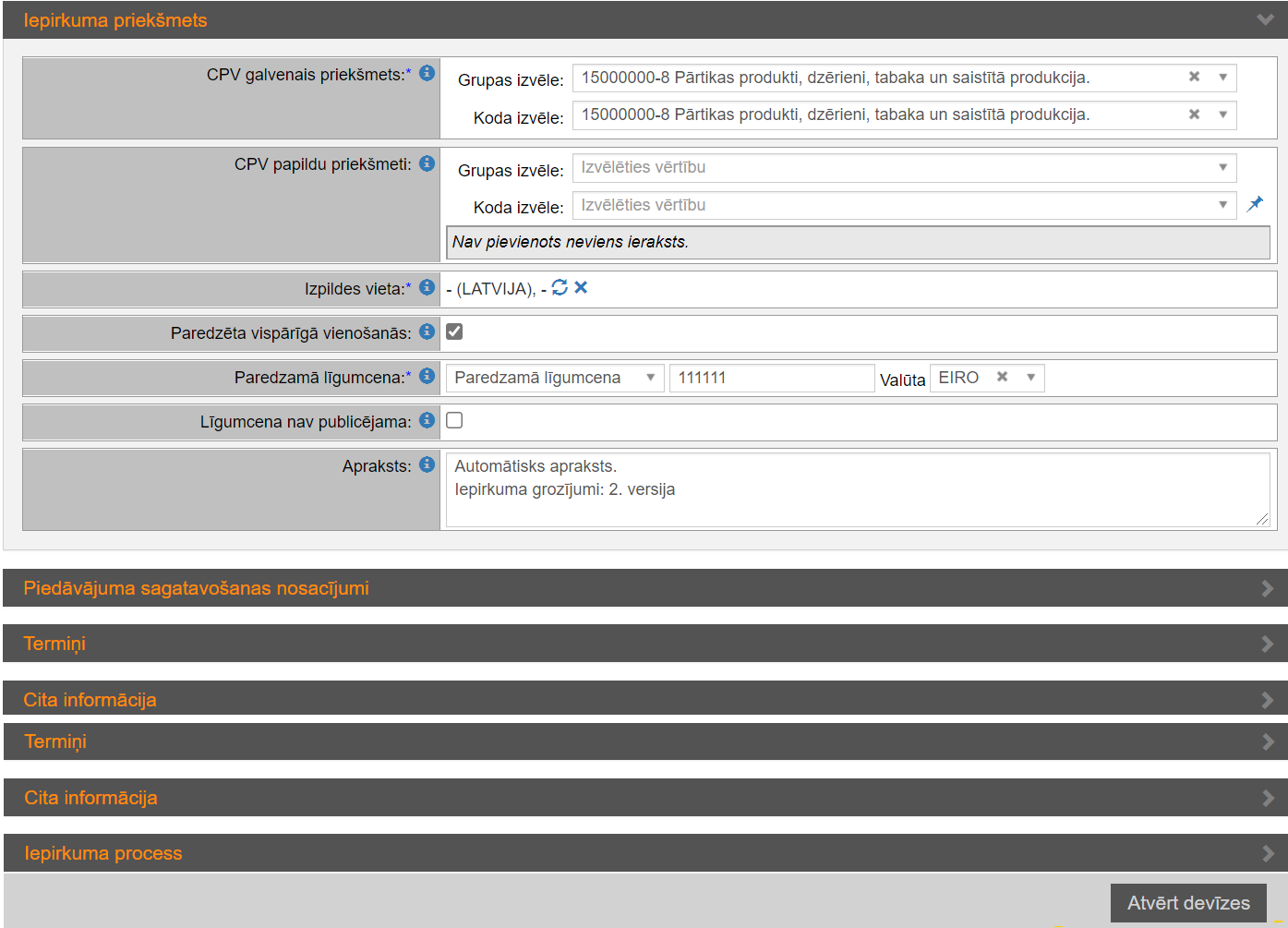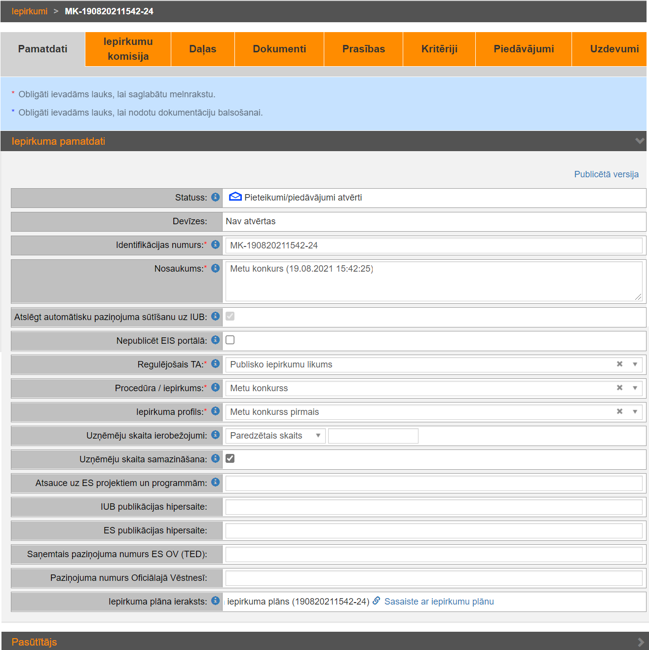 Devīzes – devīzes statuss un devīžu atvēršanas laiks. Lauks tiek attēlots, sākot no iepirkuma statusa ‘Pieteikumi/ piedāvājumi atvērti’. Atverot piedāvājumus, devīzes statuss ‘Nav atvērtas’. Pēc devīžu atvēršanas (sk. 31.6 Piedāvājumu vērtēšana metu konkursos) statuss – ‘Ir atvērtas’. |