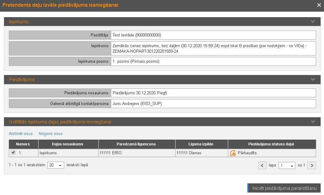 3. Uzklikšķina pogai Iniciēt piedāvājuma parakstīšanu – piedāvājuma statuss kļūst ‘Iniciēta parakstīšana’, un lietotājiem, kas norādīti kā parakstītāji, sistēma nosūta uzdevumu parakstīt piedāvājumu. Sistēma sagatavo piedāvājuma apkopojuma datni, kuru var apskatīt un lejupielādēt (sk. 15.9 Sagatavotā piedāvājuma apskate un lejupielādēšana). Ja piedāvājums tika sagatavots ārpus sistēmas un pievienojot datni, norādīts, ka tā ir šifrēta, tad piedāvājuma apkopojumā tiek iekļauta arī šifrēta piedāvājuma apliecinājuma datne, kurā iekļauta informācija, kas definēta konfigurācijas parametrā grupā SCP_VIS_CON_TXT).