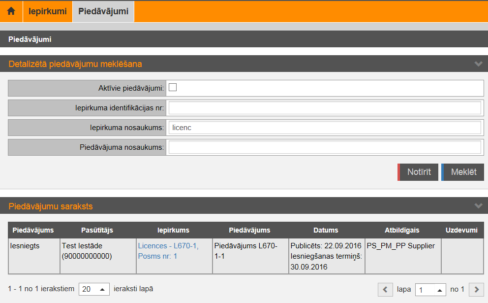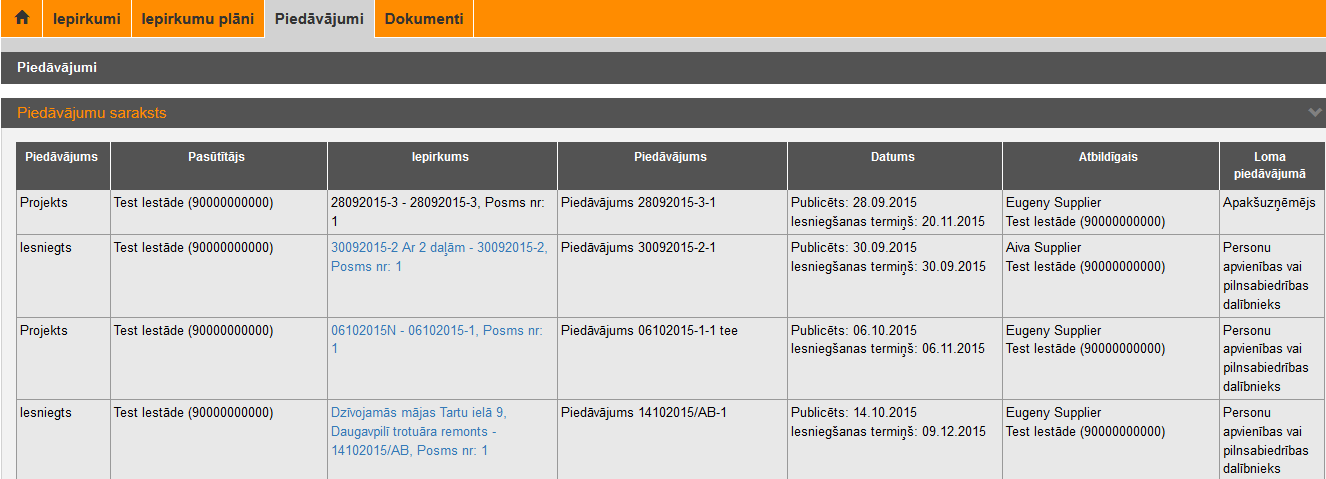 Piedāvājumi, kurus pretendents veidojis sistēmā, tiek attēloti sadaļā „Piedāvājumi”. Piedāvājumus var atlasīt: