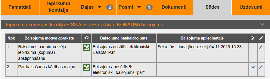 Balsojumu, kas manuāli ievadīts sistēmā apliecina divi sēdes dalībnieki, sēdes pamatdatu formā uzklikšķinot pogai Apliecināt balsojumu. Balsojumu apliecināšana veicama sēdes statusā ‘Balsošana beigusies’.