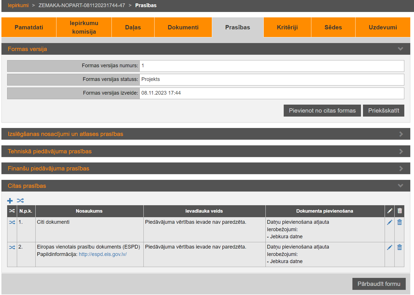 Uzklikšķinot tiek atvērta sagatavotās prasību formas priekšskats, kāda tā tiks attēlota pretendentam. Priekšskatā var skatīt visas prasības vai tikai izvēlētās iepirkuma daļas prasības. |