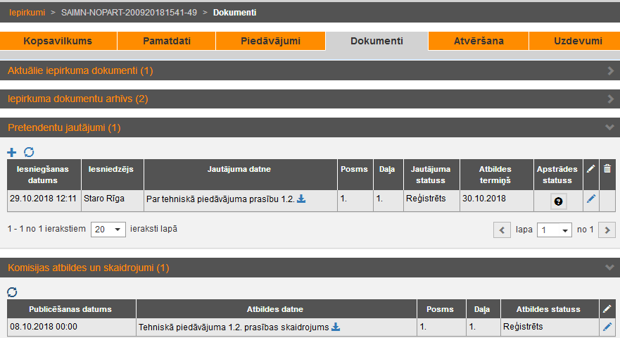 Sarakstā tiek attēlotas pasūtītāja sniegtās atbildes. Atbilde uz katru jautājumu pieejama arī, atverot jautājuma formu. Kad pasūtītājs sistēmā reģistrē atbildi, sistēma nosūta paziņojumu par papildu informācijas publicēšanu personām, kas norādītas iepirkuma ietvaros izveidotajos piedāvājumos kā atbildīgās, un piegādātāju personām, kas norādītas kā dokumentācijas saņēmējas, reģistrējoties nolikuma saņemšanai. |
