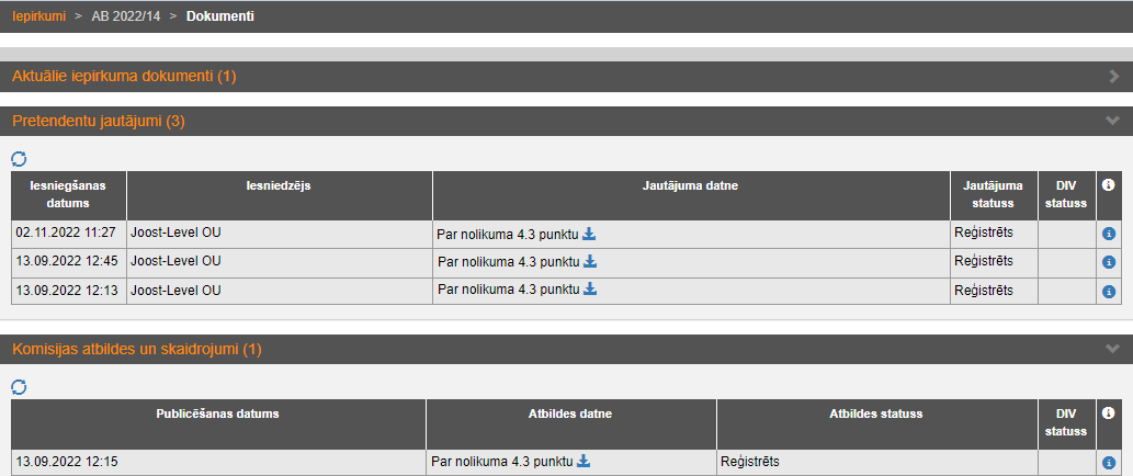 Jautājumi pasūtītājam sistēmā pievienojami iepirkuma vai piedāvājuma sadaļā „Dokumenti” blokā „Pretendenta jautājumi”. Pasūtītāja sniegtās atbildes tiek attēlotas blokā „Komisijas atbildes un skaidrojumi”:
