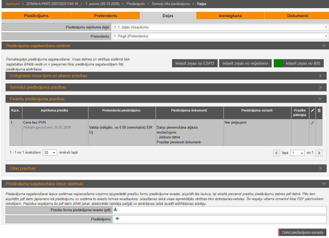 Izvēlas iepirkuma daļu, kurai ievadāms piedāvājums. Ja izvēlētajai daļai iepirkumā atļauts iesniegt variantus, uzklikšķinot pogai Pievienot variantu, sistēma izveido jaunu piedāvājuma variantu. |