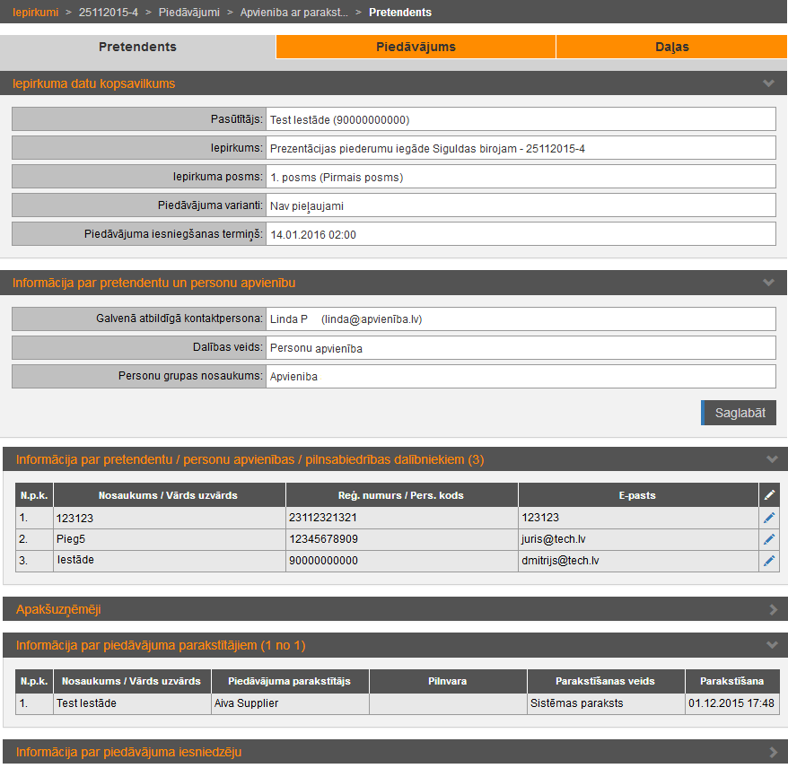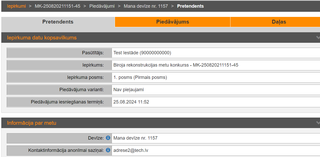 Piedāvājuma sadaļā „Pretendents” – informācija par pretendentu, apakšuzņēmējiem, parakstītājiem u.c. saistītā informācija.