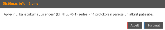 Uzklikšķinot Turpināt – protokola atvasinājums tiek apliecināts, un sēdes formas blokā “Sēdes protokola kopijas apliecinājumi” pieejama sistēmas ģenerētā protokola apliecinājuma datne.