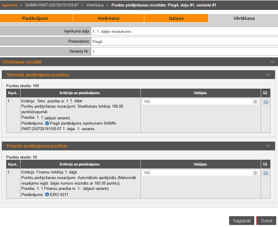 loceklis sadaļā “Piedāvājumi – Vērtēšana” izvēlas iepirkuma daļu un