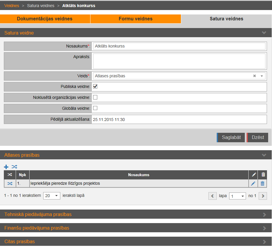 piedāvājuma un citas prasības. Izvēršot sadaļu, tiek attēlots veidnē