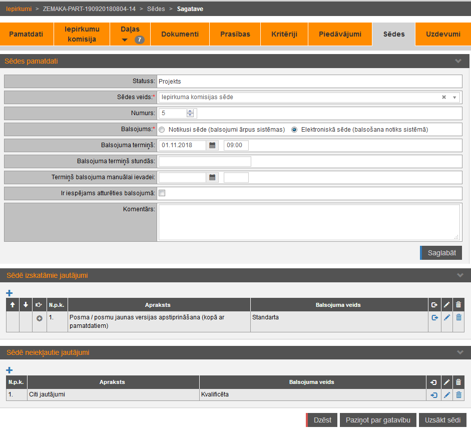 Piezīme! Iepirkumam var būt tikai viena sēde statusā ‘Projekts’.