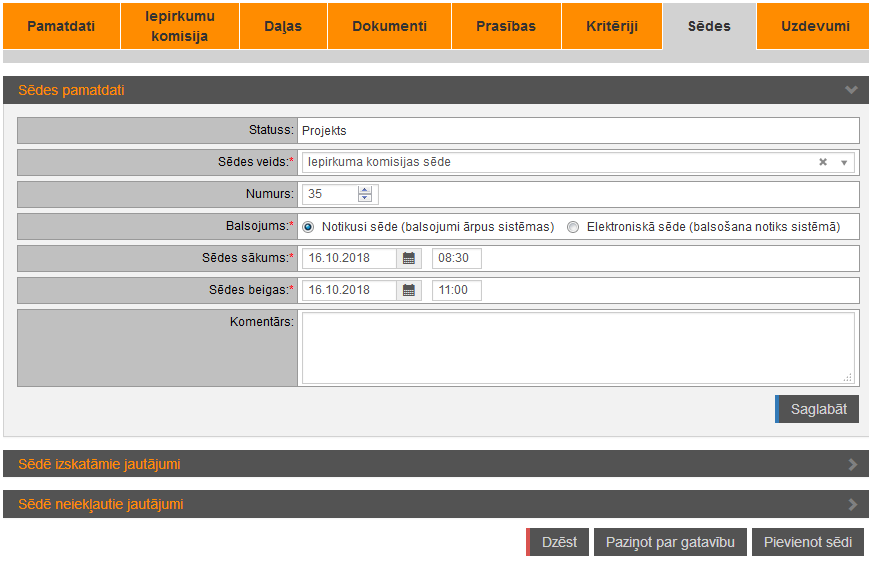 Kad ievadīti visi sēdes dati, uzklikšķinot pogai, iepirkuma komisijas vadītājam un sekretāram tiek nosūtīts uzdevums izsludināt sēdi, bet pārējiem IK locekļiem paziņojums, ka sēdes projekts ir sagatavots izsludināšanai (sk. 6.5 Paziņošana par gatavību). |