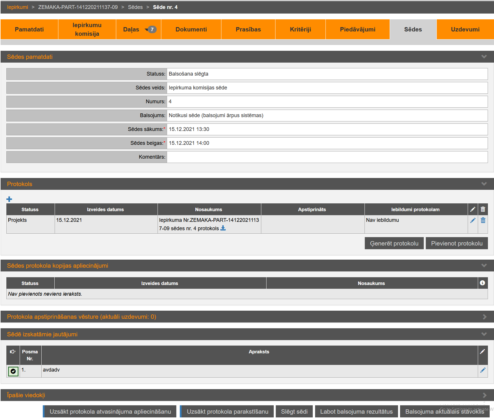 Sēdes protokols un darbības tā apstrādei (sk. 6.15 Sēdes protokola pievienošana). |