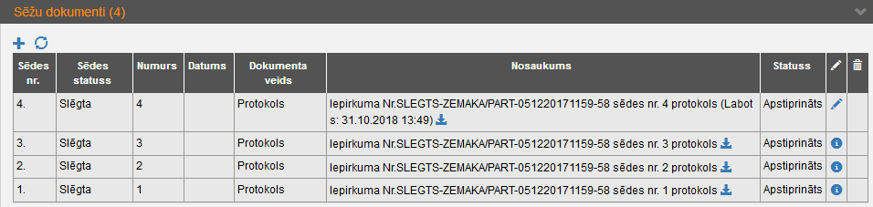 Blokā “Dokumenti – Sēžu dokumenti” tiek attēloti visi ar iepirkumu saistīto sēžu protokoli, protokolu kopijas apliecinājumi, balsojuma motīvam piesaistīti dokumenti, ārpus sistēmas izdarīta balsojuma dokumenti.