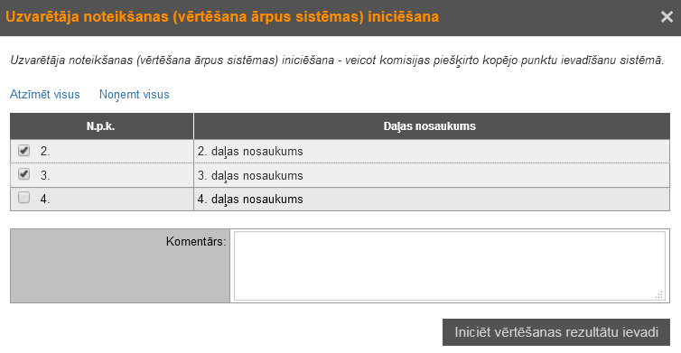 Atzīmē iepirkuma daļas, kurām tiks ievadīts vērtēšanas rezultāts, pievieno komentāru, ja nepieciešams, un uzklikšķina pogai Iniciēt vērtēšanas rezultātu ievadi – izvēlēto daļu statuss kļūst ‘Uzvarētāju noteikšana’.