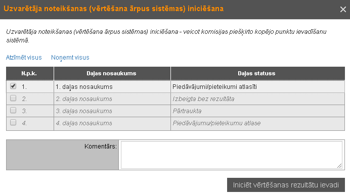 Atzīmē iepirkuma daļas, pievieno komentāru, ja nepieciešams, un uzklikšķina pogai Iniciēt vērtēšanas rezultātu ievadi.