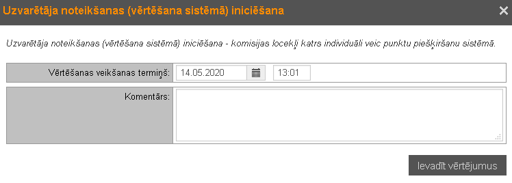 Lai iniciētu uzvarētāja noteikšanu, uzklikšķina pogai Ievadīt vērtējumus Iepirkumiem, kuriem vērtēšana nav pabeigta, tai skaitā izbeigtiem un pārtrauktiem iepirkumiem, ja šajos iepirkumos ir daļas statusos ‘Līgums piešķirts’, Izbeigta bez rezultāta’ vai ‘Pārtraukta’, var veikt atkārtotu vērtējumu ievedi, nospiežot Ievadīt vērtējumus atkārtoti.
