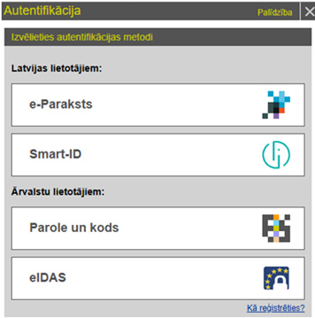 •eIDAS – ar eIDAS autentifikācijas iespējām (skat. aprakstu 8.4 Autentificēšanās ar eIDAS).