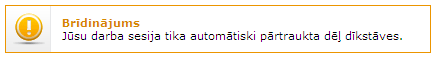 Piezīme! Ja sistēma pārtrauc aktīvu lietotāja sesiju dīkstāves dēļ, attiecīgā lietotāja darbs ar sistēmu tiek pārtraukts un lietotāja iesāktās, bet nesaglabātās izmaiņas datos tiek atceltas.