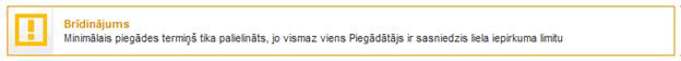 § attēlo brīdinājuma paziņojumu tādā gadījumā, ja kādai no Groza precēm ir ievadīts liels preču skaits, līdz ar to, sistēma veic aprēķinu, ka Piegādātājs šādu preču daudzumu nespēs piegādāt iepriekš norādītajā piegādes termiņā: