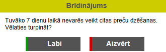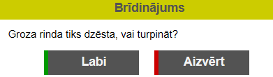 Sistēmas lietotājs, kuram ir savs aktīvais Grozs, tajā veic preces ieraksta dzēšanu. Pie preces ieraksta dzēšanas tiek attēlots brīdinājuma paziņojums:
