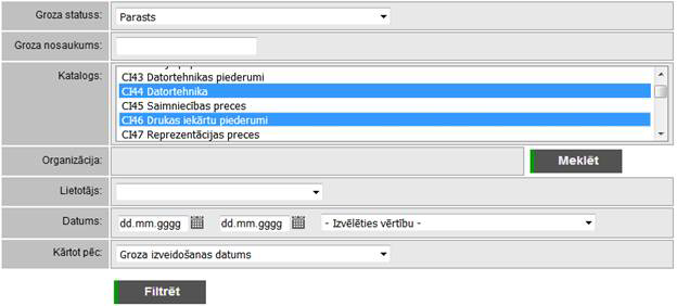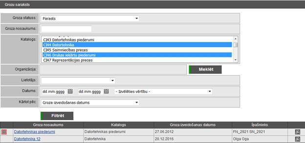 Sistēmas lietotājs filtrēšanas blokā veic atlases kritēriju norādīšanu. Lietotājam veicot filtrēšanu, tiek attēlots organizācijas aktīvo Grozu saraksts atbilstoši norādītajiem atlases kritērijiem.