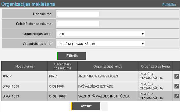 kritērijiem atrod kādu organizāciju, tad to attēlo zem filtrēšanas bloka