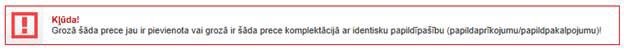•ja konkrēta prece ir pievienota aktīvajam Grozam un sistēmas lietotājs to mēģina atkārtoti pievienot, tad sistēma attēlo kļūdas paziņojumu:
