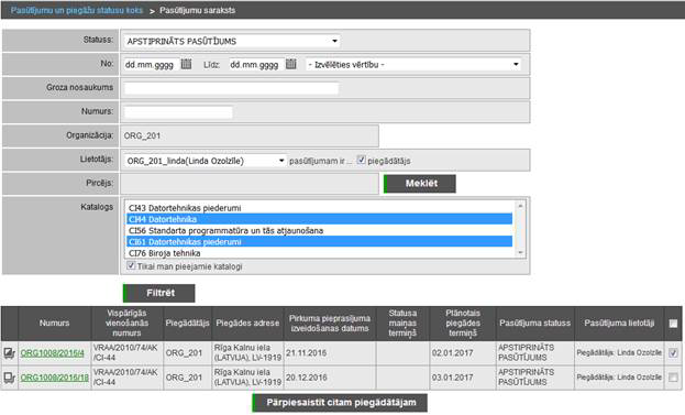 •Lietotājs – organizācijas lietotāju izvēle. Atzīmējot izvēles rūtiņu, sistēma atlasīs pasūtījumus, kuros izvēlētais lietotājs ir Piegādātājs. Pircējiem atbilstoši iespēja atlasīt pasūtījumus, kuros izvēlētais lietotājs ir Iepircējs vai Apstiprinātājs.