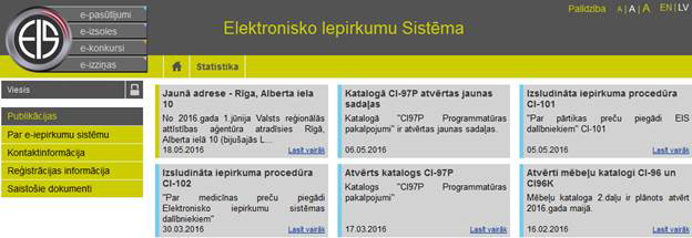 •E-izsoles – uzklikšķinot tiek atvērta e-katalogu apakšsistēmas sākumlapa.